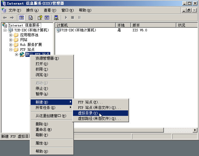 開始--->程序--->管理工具--->IIS信息管理器 打開IIS管理工具.展開FTP站點,在"默認FTP站點上右擊--->新建"虛擬目錄" | |