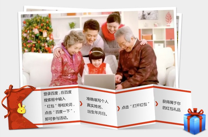 寓意平安送福的紅包,是中國(guó)年里最溫情的親朋紐帶。而2011兔年春節(jié)的紅包尤其特別。據(jù)悉,從2月2日到2月17日(大年三十到正月十五),只要登錄百度首頁(yè),在搜索框中輸入“紅包”及包含紅包的關(guān)鍵字,搜索與紅包相關(guān)的信息,即可得到紅包大禮。全民可參與,操作極簡(jiǎn)單,用紅包回饋新老網(wǎng)民……對(duì)于這近乎“瘋狂”的舉動(dòng),業(yè)內(nèi)人士認(rèn)為,百度此次借春節(jié)全民“大遷徙”的時(shí)機(jī)組織的搶紅包活動(dòng),一二線城市深度網(wǎng)絡(luò)用戶(hù)將極大帶動(dòng)地縣級(jí)城市的新網(wǎng)民參與,讓我國(guó)偏遠(yuǎn)地區(qū)和互聯(lián)網(wǎng)不發(fā)達(dá)的地縣級(jí)城市百姓能夠接觸互聯(lián)網(wǎng),該活動(dòng)的公益價(jià)值將給中國(guó)互聯(lián)網(wǎng)帶來(lái)深遠(yuǎn)的影響。